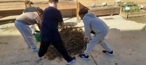 Las visitas semanales al huerto se desarrollan en sesiones de media hora, en las que los grupos se encargan de mantener el espacio activo y en buen estado. Durante estas jornadas riegan las plantas, airean la tierra, añaden abono cuando es necesario, realizan plantaciones y podas, y colaboran en la limpieza y el cuidado de las zonas verdes. Además, aprenden a elaborar compost utilizando las pieles de plátano y mandarina de los almuerzos, una práctica que les ayuda a comprender la importancia del reciclaje orgánico.